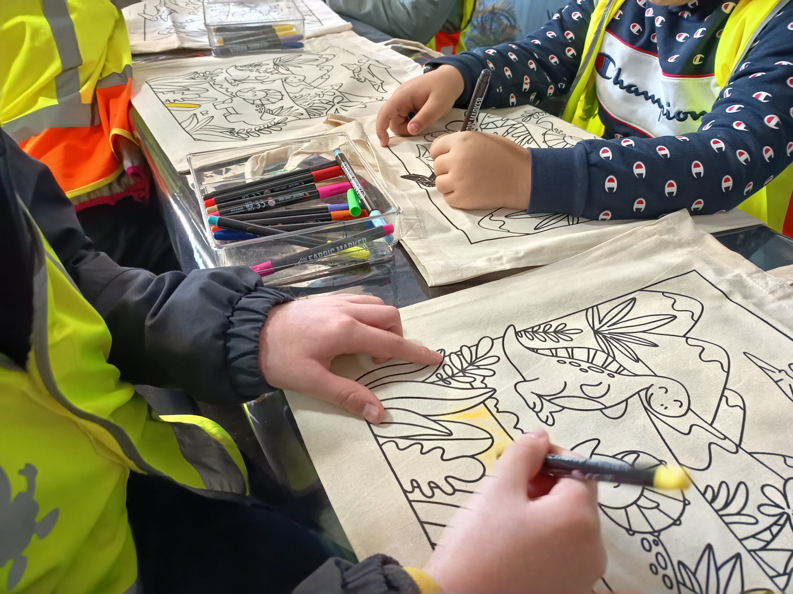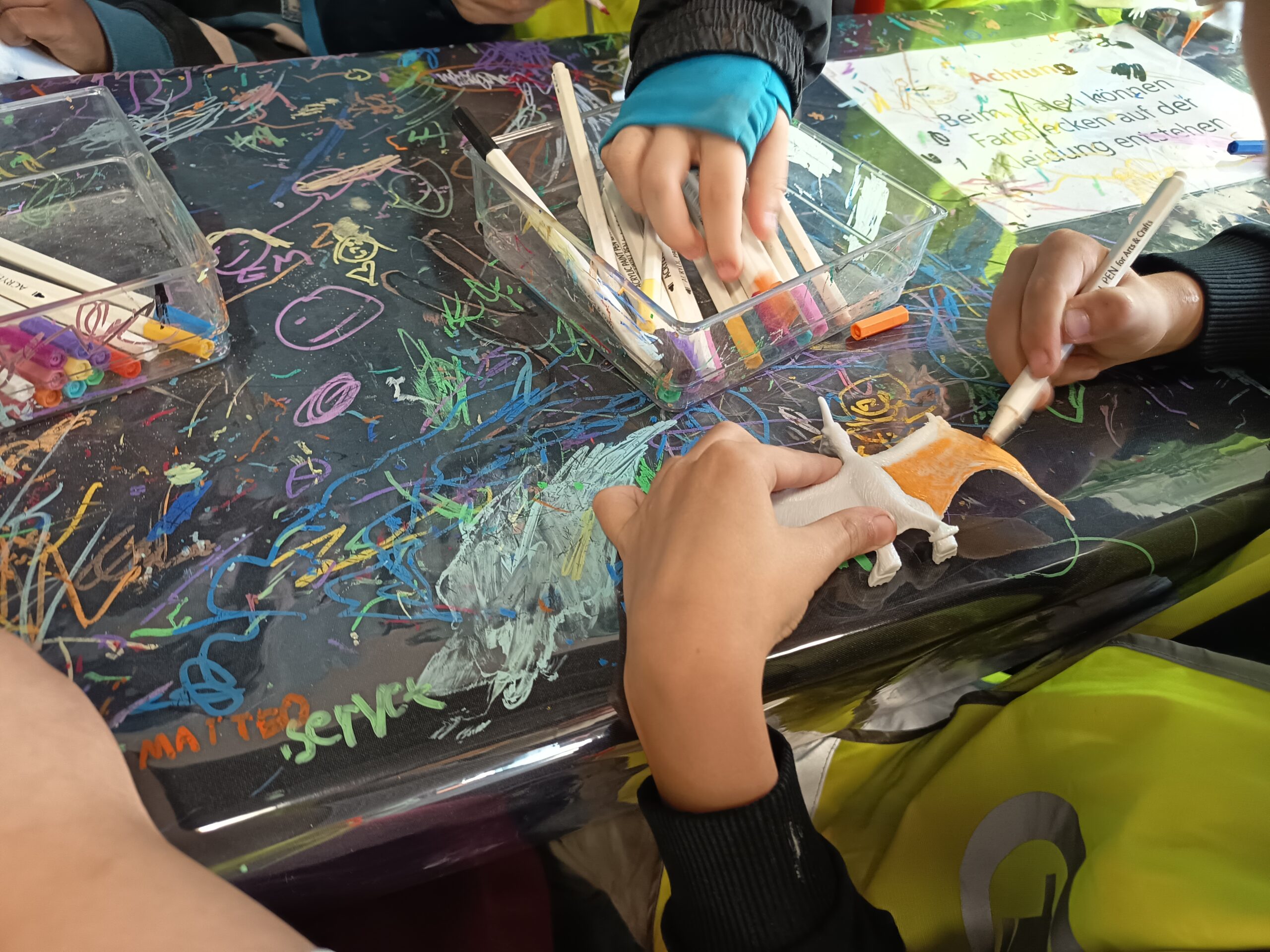 Zum Abschluss buddelten die Schüler*innen wie Archäolog*innen ein Skelettmodell aus dem Sand heraus und bemalten kleine Dinosaurier oder bedruckte Stoffbeutel.