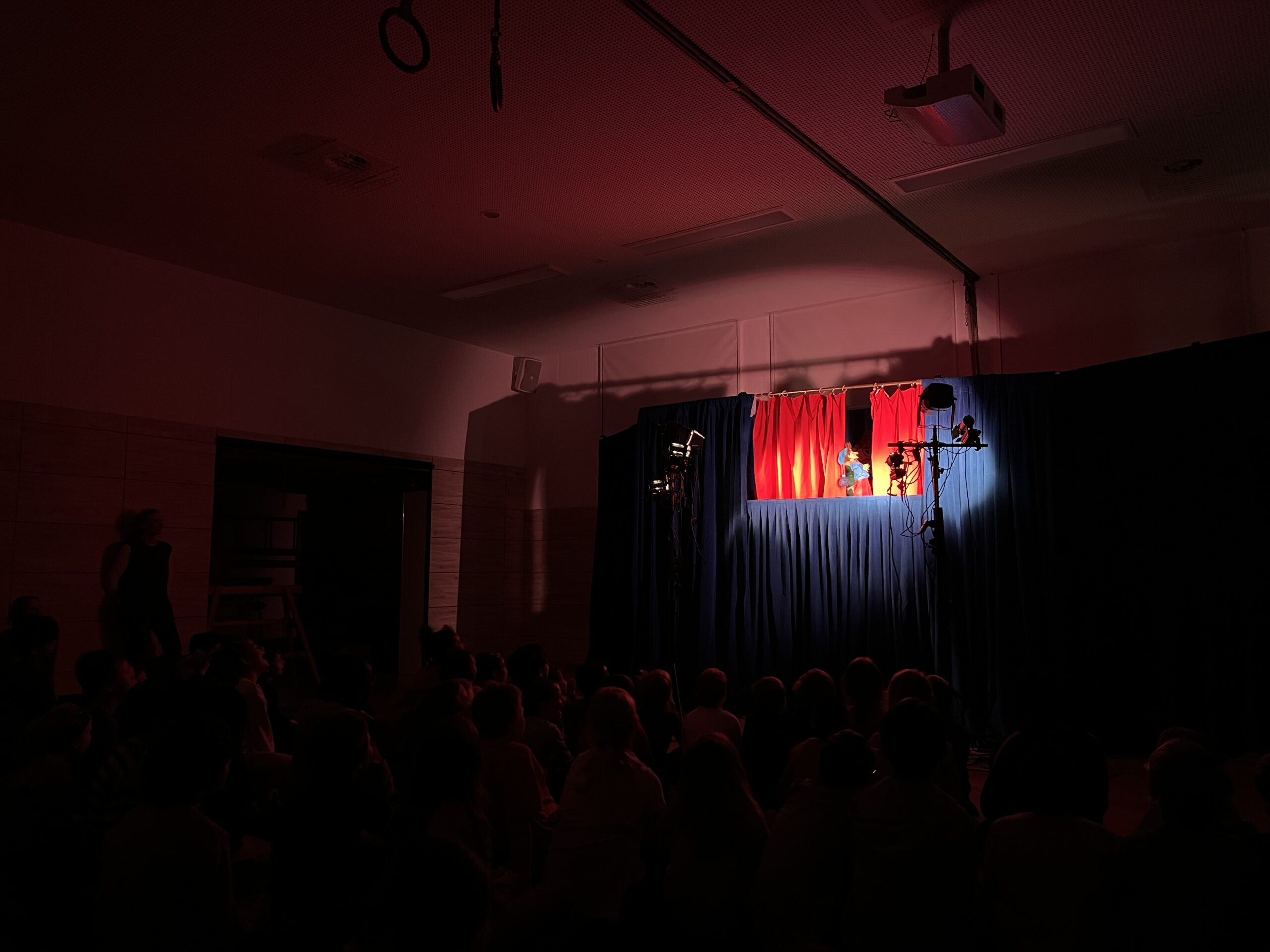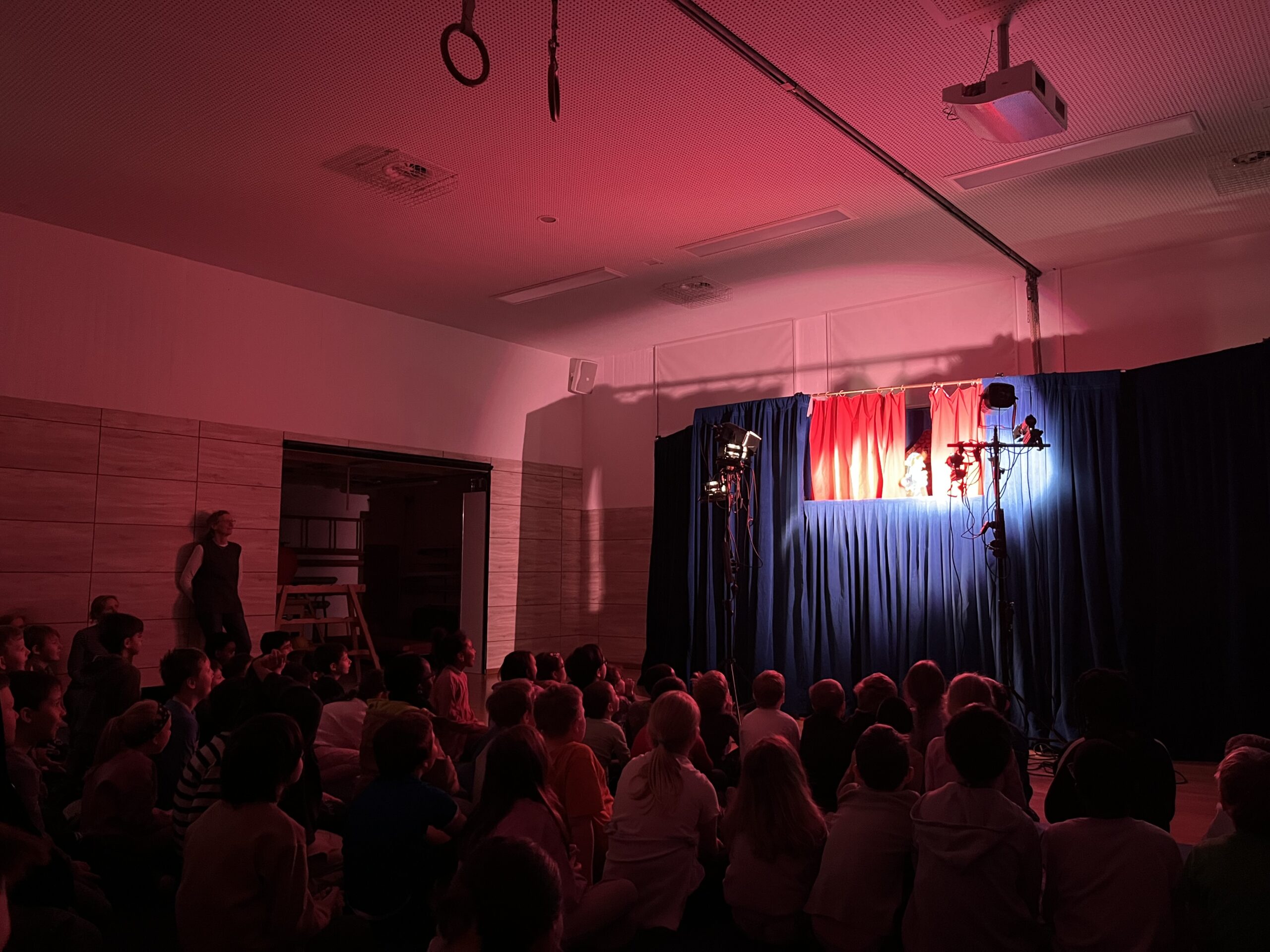 Für die Aufführung wurde die Turnhalle abgedunkelt und in eine kleine Theaterbühne verwandelt. Alle Schüler*innen versammelten sich und freuten sich auf ein unterhaltsames Theaterstück.