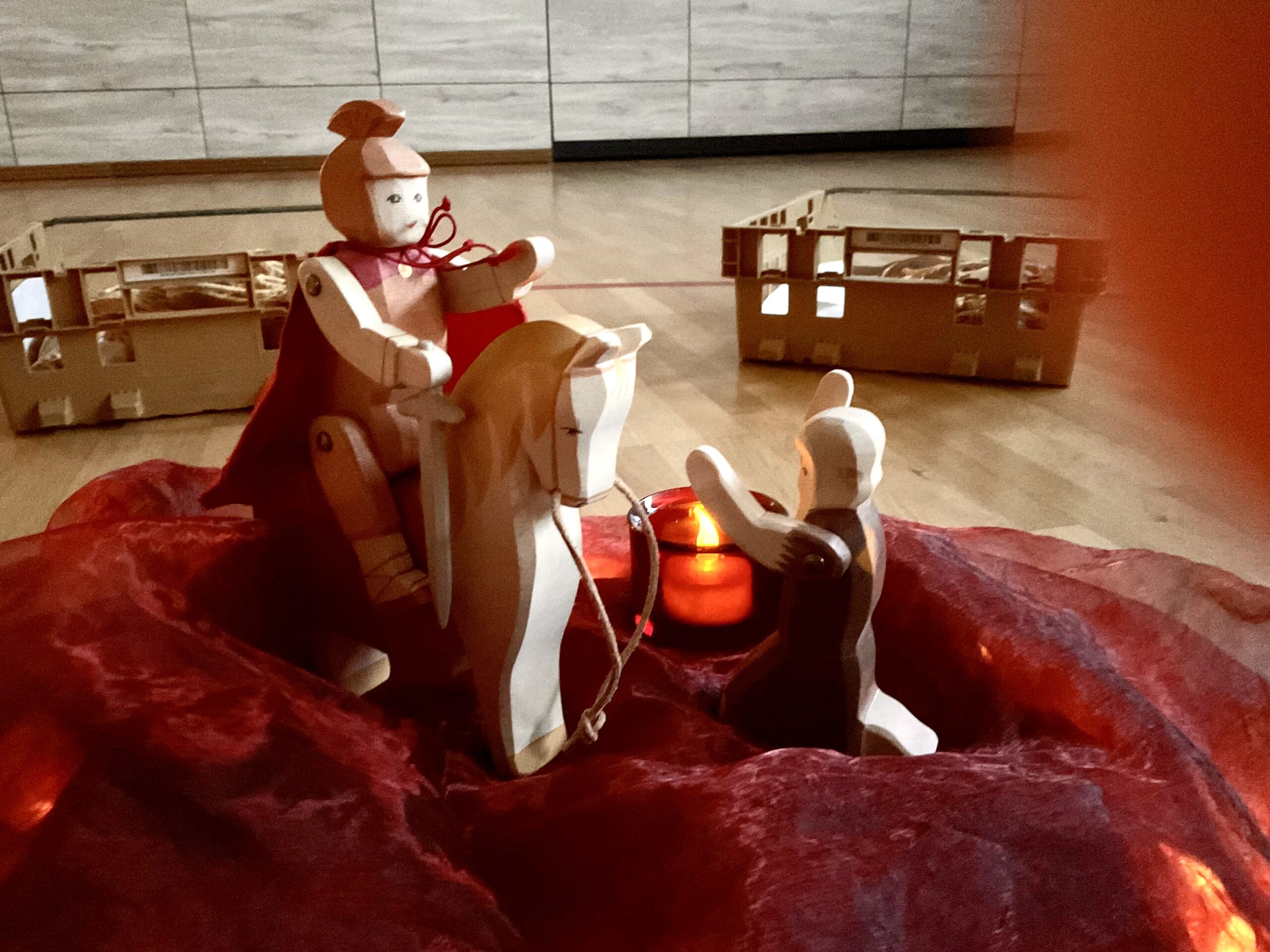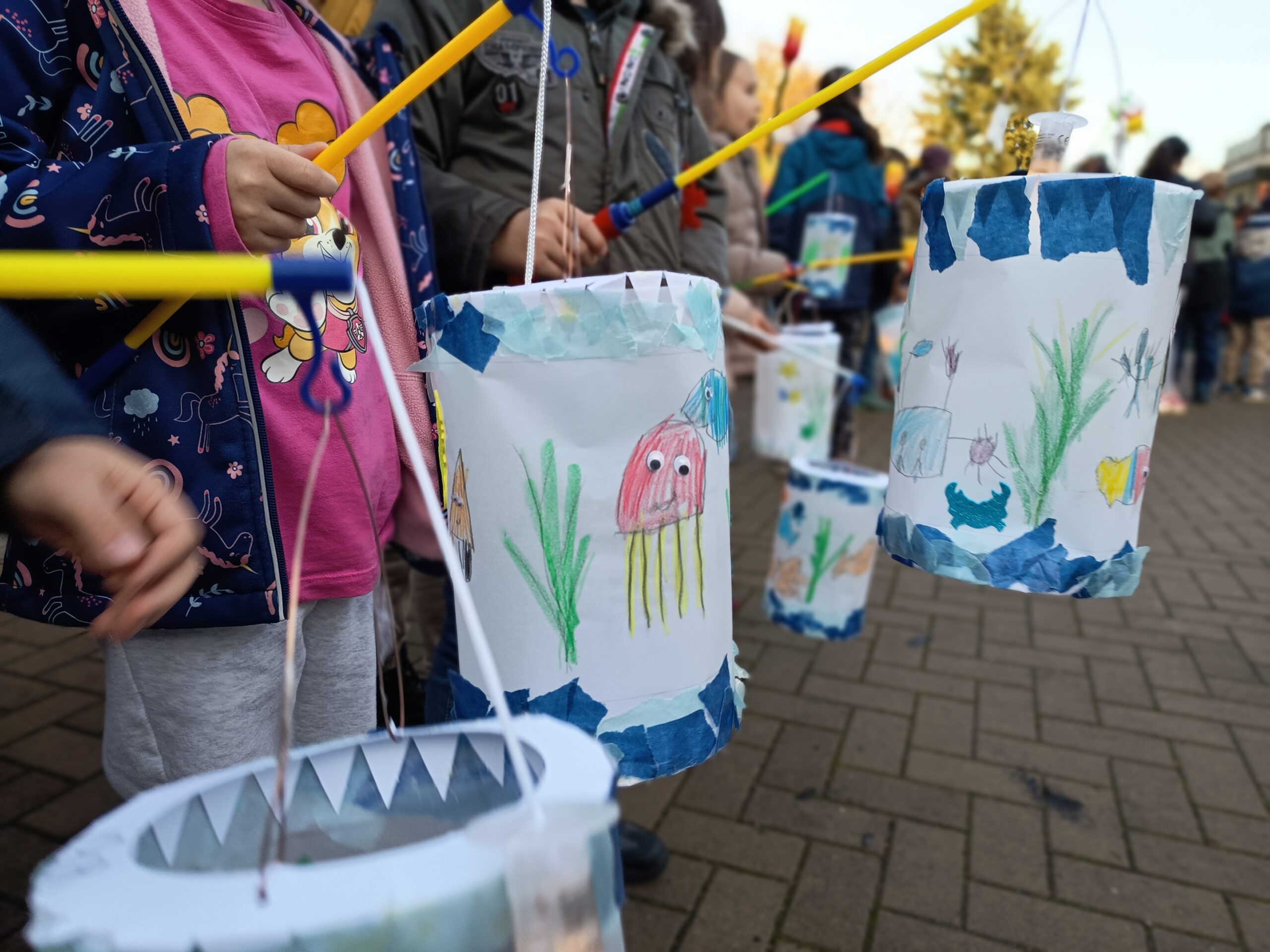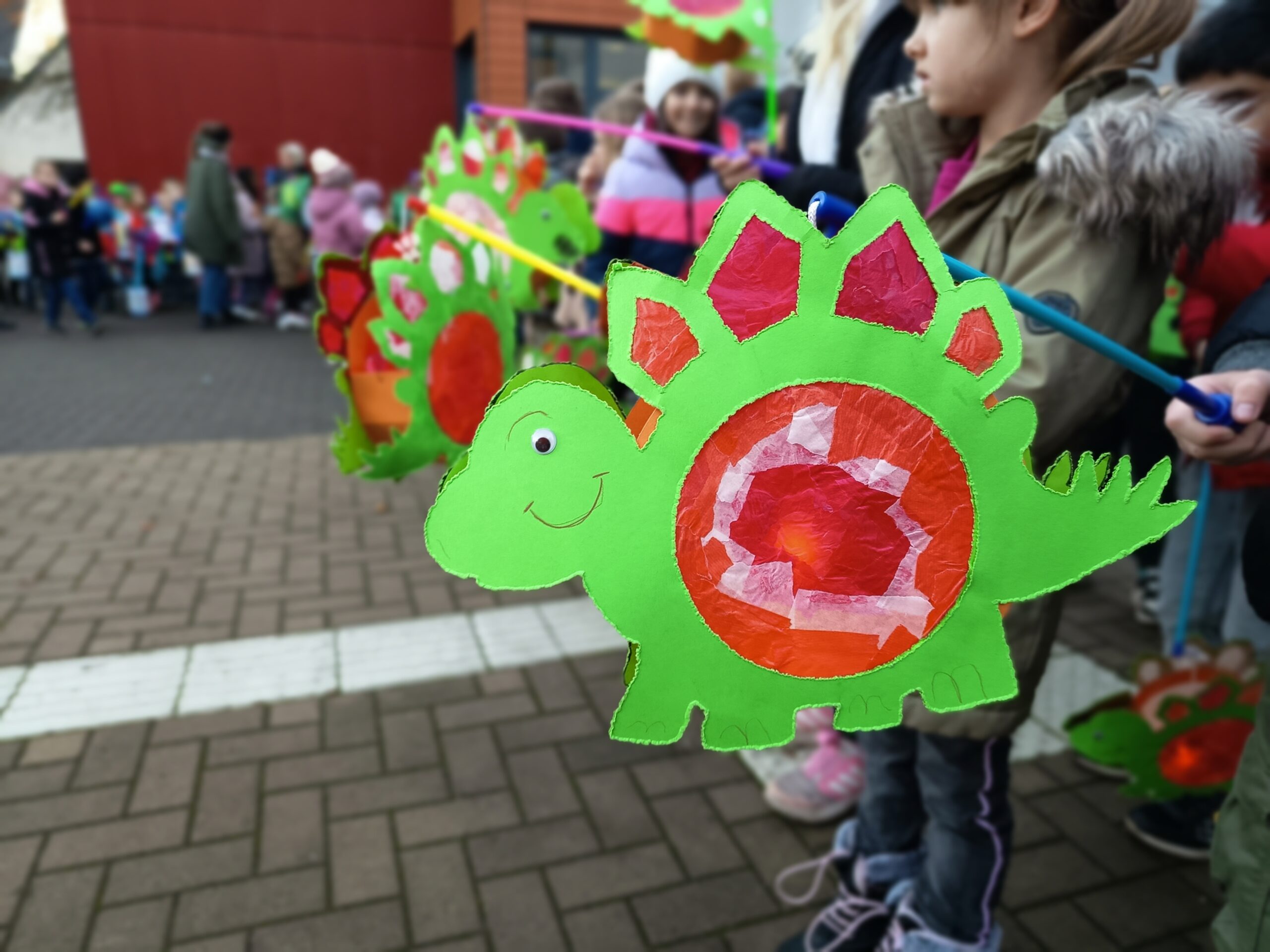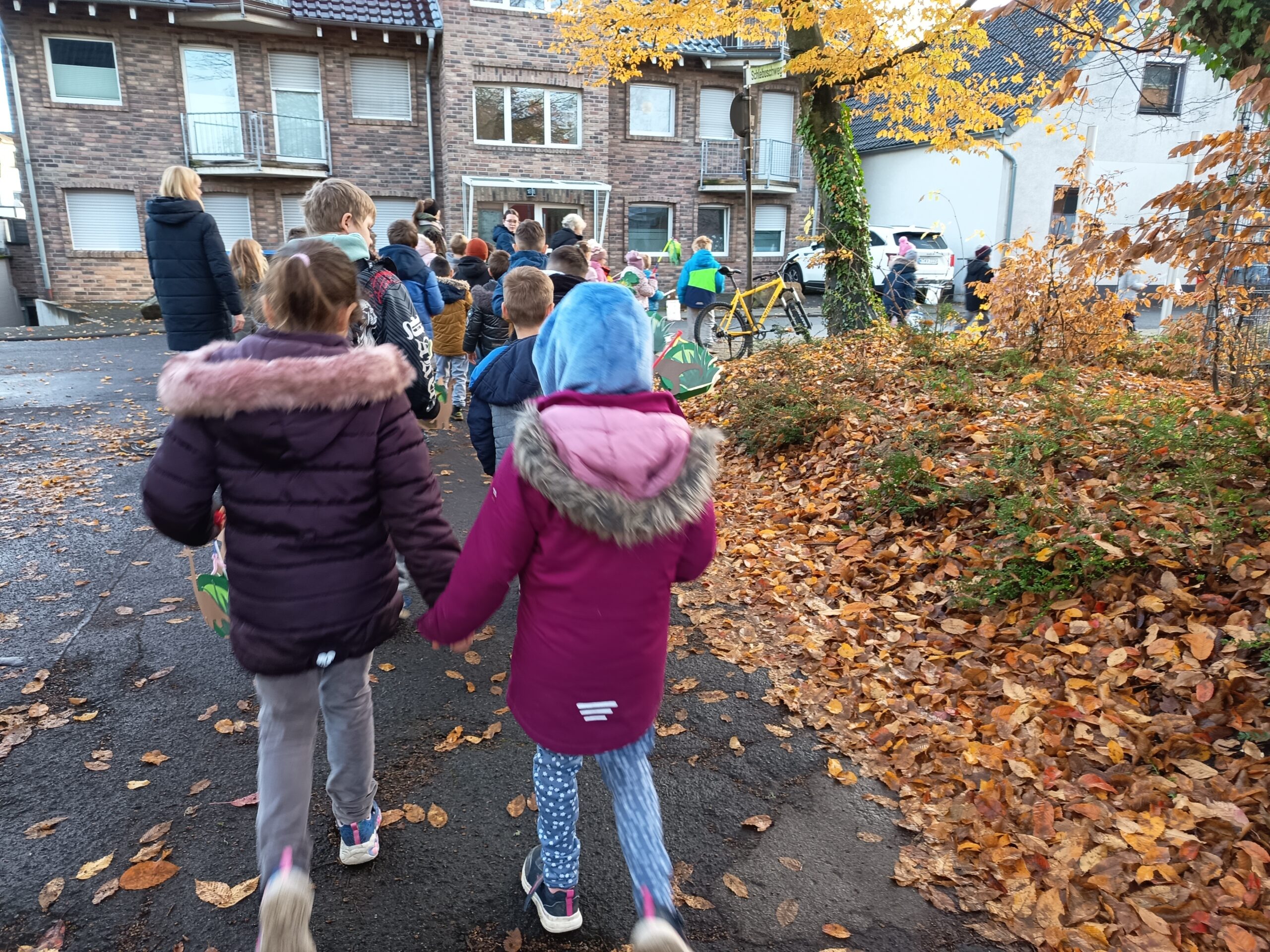 Wir sind mit vielen bunten Laternen und lautem Gesang durch Stotzheim gezogen und haben uns anschließend in der dunklen Turnhalle getroffen. Nur wenige Lichter leuchteten dort. Kinder aus der Koalaklasse führten die Sankt Martins-Geschichte auf und erinnerten uns damit, wie wichtig es ist, zu teilen und füreinander da zu sein.