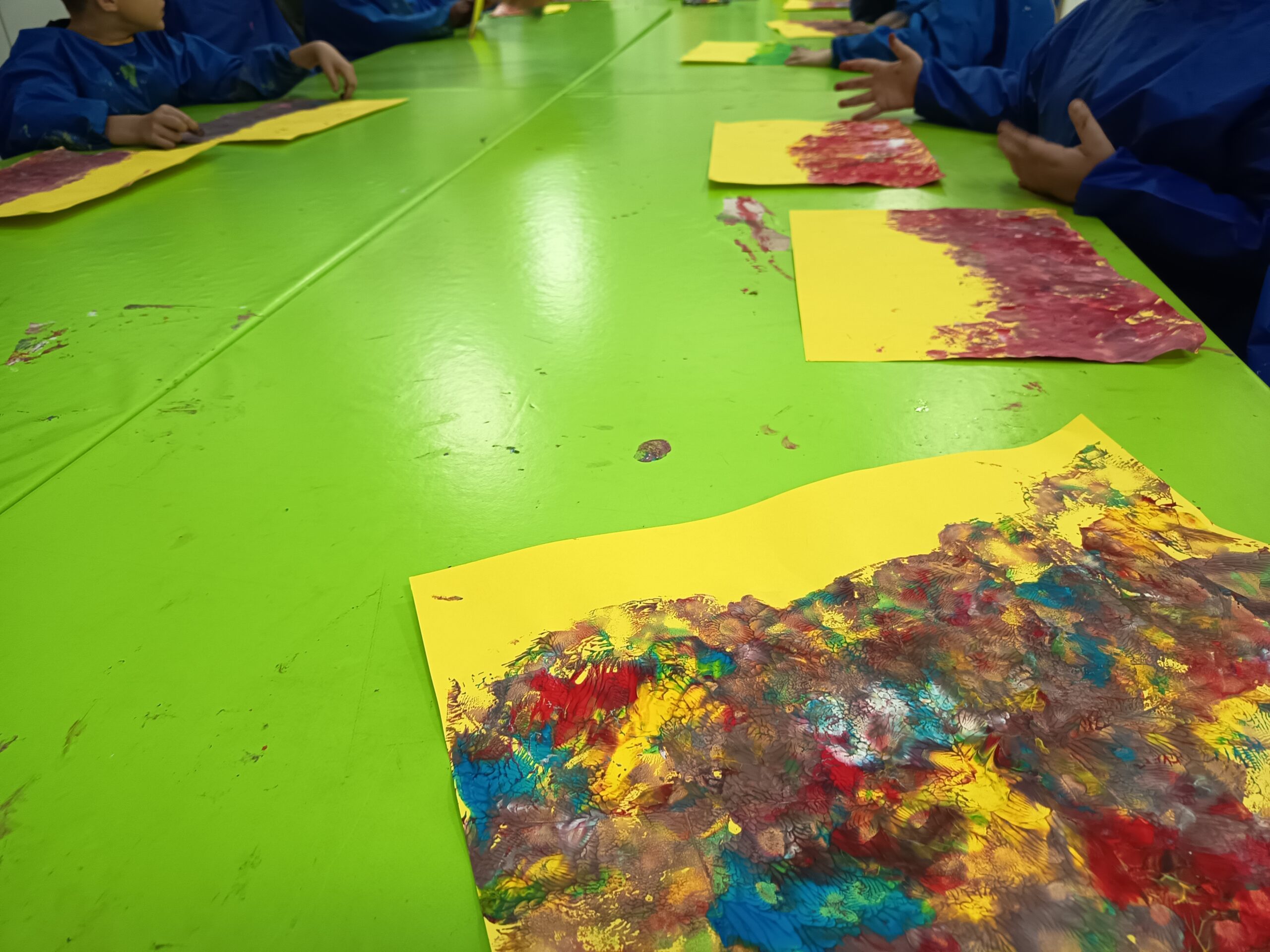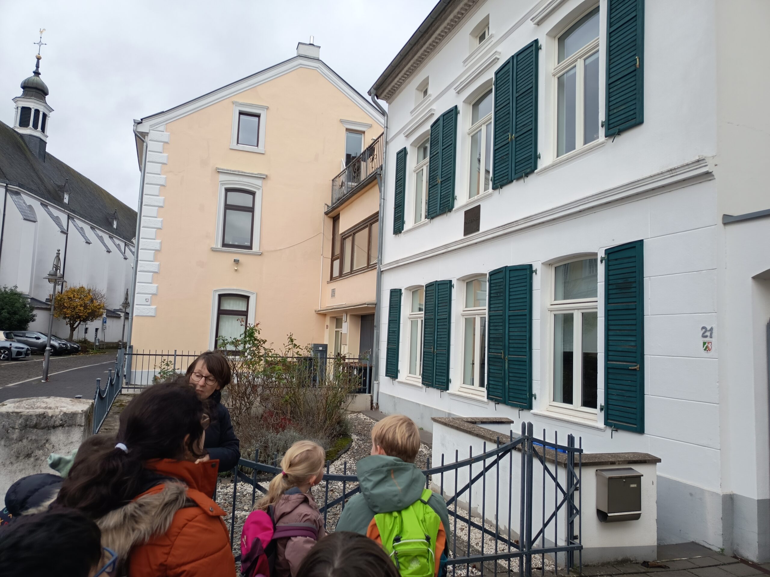 Nach der Bildbetrachtung im Museum wurden die Schüler*innen selbst kreativ. Sie gingen in das sogenannte „Fantasielabor“, was direkt hinter dem Geburtshaus von Max Ernst ist. Dort probierten sie die Abklatschtechnik aus, die auch Max Ernst in seinen Arbeiten nutze. Durch das Abklatschen und Umklappen von Farbe auf Papier entstanden interessante Muster und Formen.